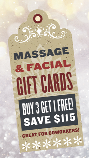 Happy Holidays! Massage & Facial Gift cards: Buy 3 Get 1 FREE Save $115. One Hour Massage or Facial ONLY $95 Save up to $20