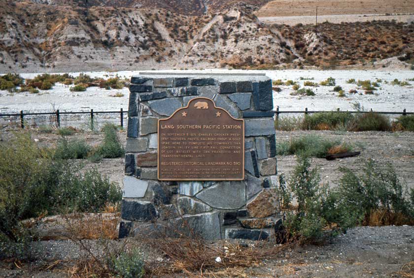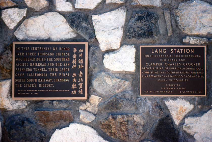 Thousands of Chinese laborers were hired in 1874 to build rail and tunnels, working north from Los Angeles and south from San Francisco, destined to meet in the middle at Lang Station. Despite the back-breaking work of the Chinese crews to complete the project, a team of Caucasian workers were hired to complete the last 1,000 feet of rail.