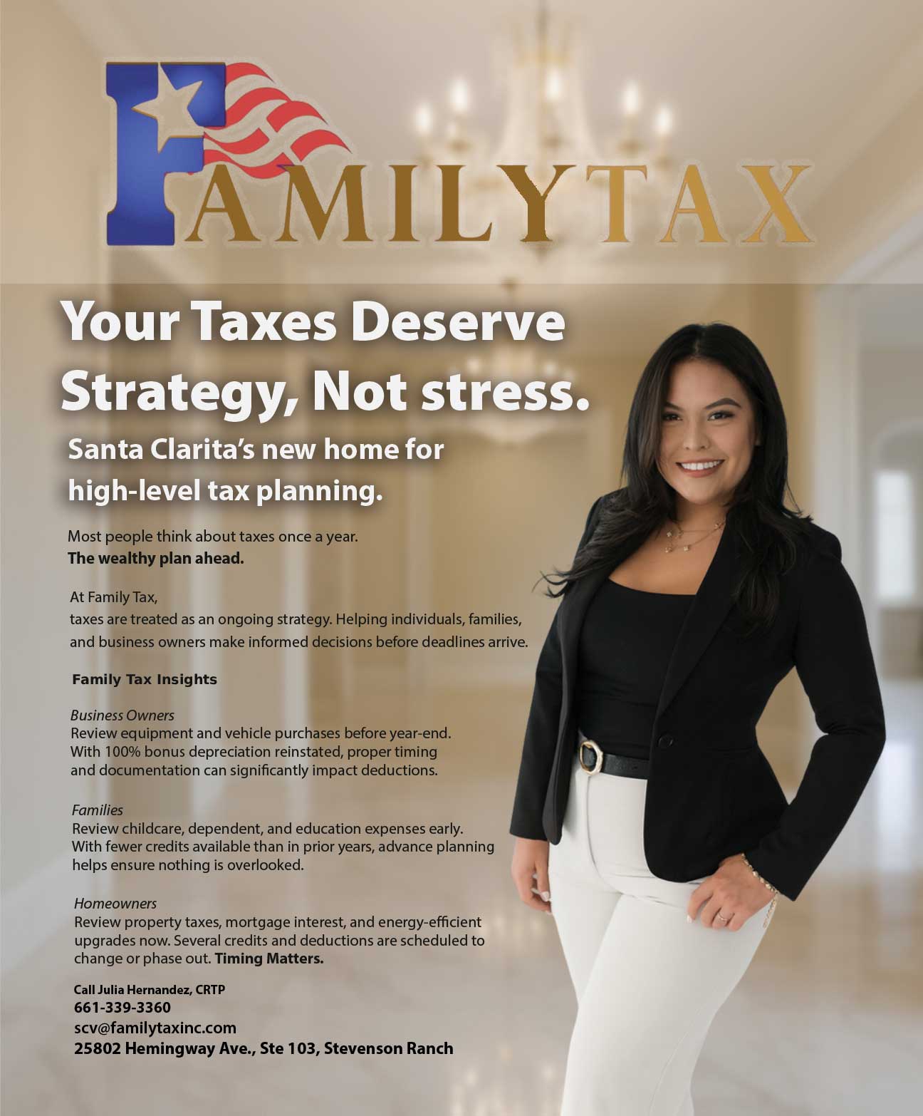 Family Tax Inc, a trusted name in tax preparation and financial services in Lancaster for many years, has officially opened a new branch in Stevenson Ranch—bringing their expertise closer to families and businesses in the Santa Clarita Valley. The new office is led by Julia Hernandez, an experienced tax and accounting professional and branch manager, who brings strong industry knowledge and a genuine passion for helping clients feel confident about their finances.